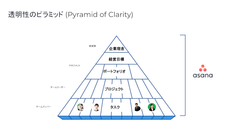 「組織の方向性を真に定め、組織の存在意義となるものがミッションです。Asana は、組織のミッションとそのミッションを支える現場の仕事との架橋を世界初リリースします。この最新機能「ゴール」のリリースで Asana は見える化のピラミッドを完成させました。」