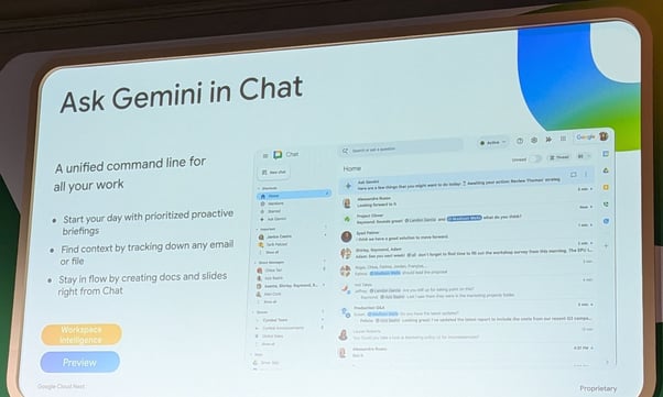 しかし現状の課題として立ちはだかるのが「コンテキストの壁(Context wall)」です 。必要な情報が異なるファイルや形式で散在し、システムがビジネスの全体像を理解していないため、人間が手作業で点と点を繋ぎ合わせる必要があり、結果として人間の処理速度がビジネススピードの限界となっていました 。新しいWorkspace Intelligenceは、各種Workspaceアプリからの情報を一元化し、この壁を打ち破ります 。特にGoogle Chat内の「Ask Gemini」は、すべての業務の統合コマンドラインとして機能し、必要なメールやファイルからコンテキストを瞬時に探し出します 。
