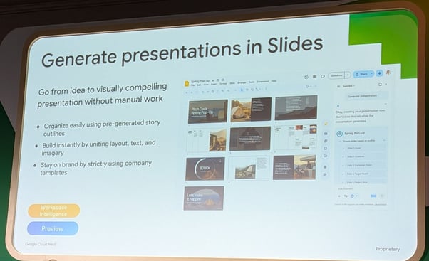 - Google Slides: 事前生成されたストーリーのアウトラインを活用して簡単に構成を整理し、レイアウト、テキスト、画像を瞬時に統合してプレゼンテーションを作成できます 。会社のテンプレートを厳格に使用するよう指示できるため、ブランドイメージも損ないません 。