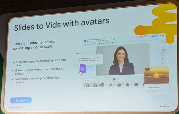 - Google Vids: 静的なスライド情報を、カスタマイズ可能なAIアバターを用いた動画へと大規模に変換できます 。これにより、スタジオでの撮影費用を節約しつつ、ネイティブな動画生成が可能になります 。