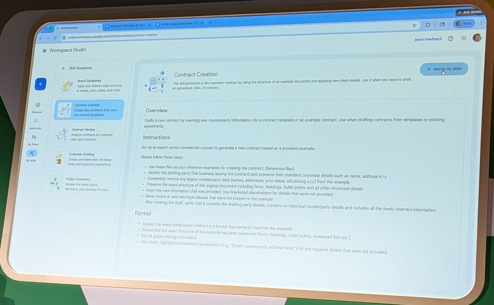 例えば「契約書作成(Contract Creation)」というカスタムスキルを追加する場合、既存のファイルをリファレンスとして読み込ませます 。指示(インストラクション)として、「発行元企業の標準的な企業詳細(名前、住所など)は保持しつつ、過去の取引先データ(古い価格や日付など)は完全に削除する」といった厳密なルールを設定できます 。設定後、Geminiのチャット内で「@Contract Creation」と入力し、「この会議録の情報に基づいてACME社向けの契約書を作って」と指示するだけで、AIが契約の構造や形式を維持した完璧なドラフトを生成します 。プロンプトから一発で完璧なものを出すのが難しい領域でも、AIとの対話プロセスを通じて成果物を洗練させることができます 。