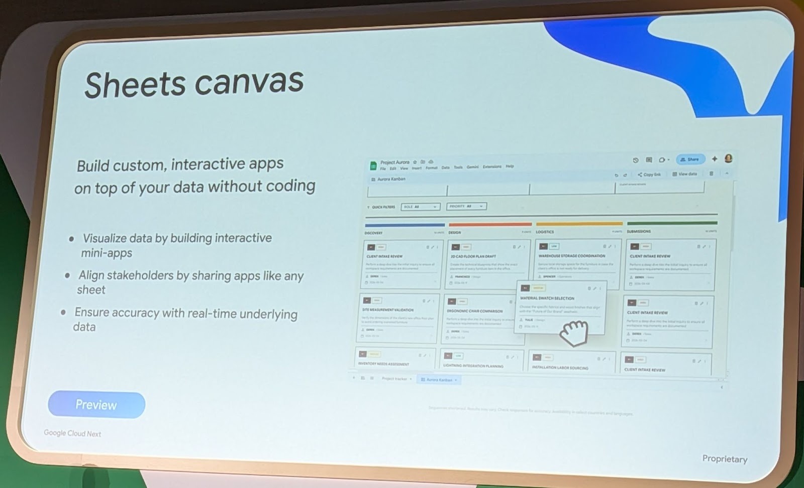 さらに注目すべきは「Sheets canvas」です 。これは、コーディングなしでデータの上にカンバンボードのようなインタラクティブなミニアプリを構築できる機能です 。リアルタイムの基盤データに基づいて、Canvas上で予算シミュレーションなどの分析を対話的に行い、関係者とスムーズに合意形成を図ることが可能になります 。