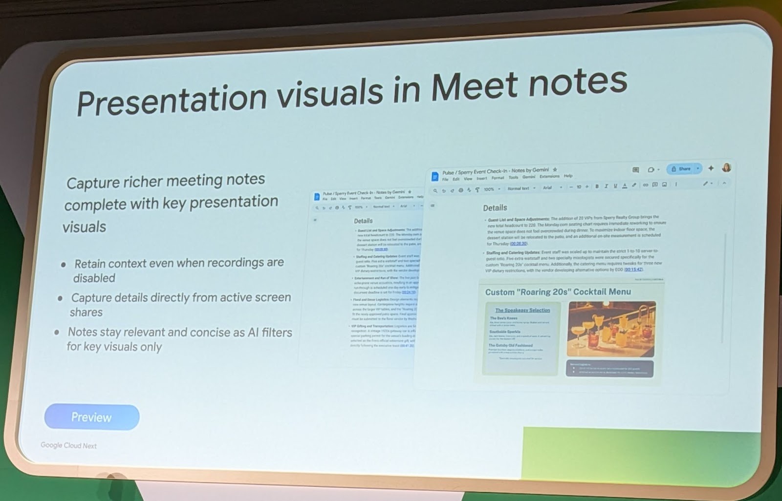 また、ミーティングの文字起こし(Notes by Gemini)にも画期的な機能が追加されました 。特筆すべきは、画面録画が禁止されているような規制の厳しい業界・環境においても、AIがアクティブな画面共有からプレゼン中の重要な視覚情報(スライド画像など)だけをフィルターして抽出し、ドキュメントに記録できる点です 。これにより、コンテキストを失うことなくセキュアに会議の要点を保存できます 。
